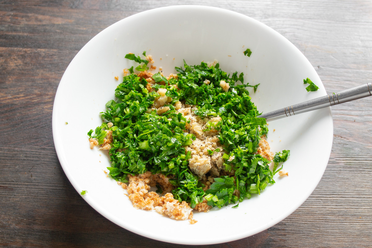 Обрываем листики петрушки, режем очень мелко. Добавляем 2 столовые ложки измельченной зелени в начинку.