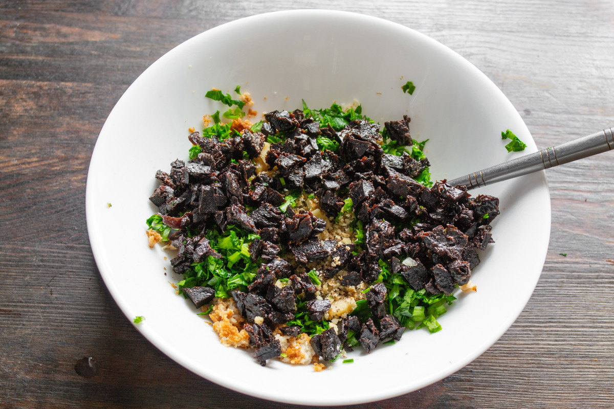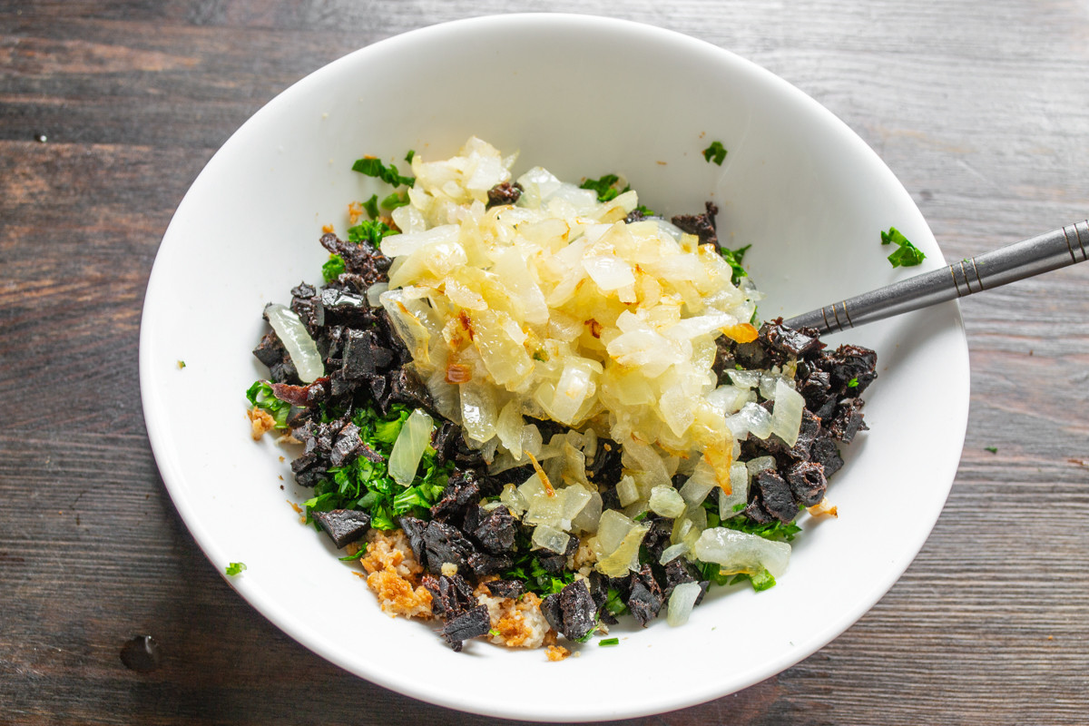 Если чернослив чересчур сухой, то заранее замачиваем его в теплом чае на несколько часов. Промываем чернослив, нарезаем мелко. Добавляем нарезанный чернослив в начинку.