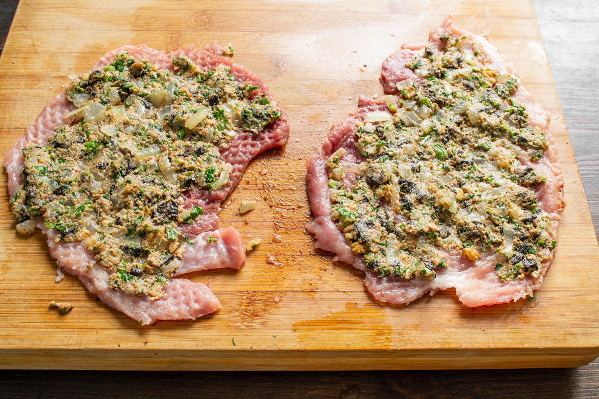Отбитые куски свинины солим и перчим по вкусу. Втираем приправы аккуратными массирующими движениями. Начинку делим пополам, выкладываем на отбитое мясо. Разравниваем начинку по отбивной так, чтобы по краям оставалось свободным примерно пол сантиметра или чуть больше.