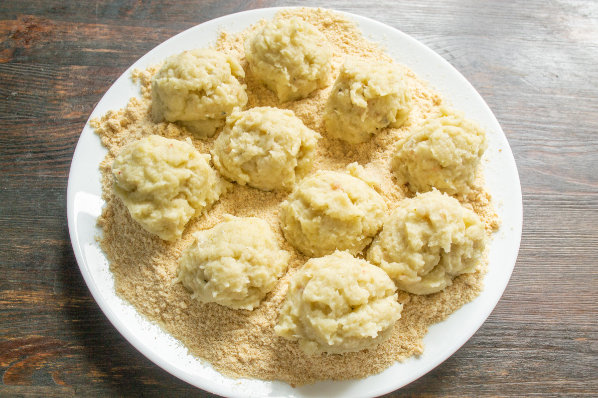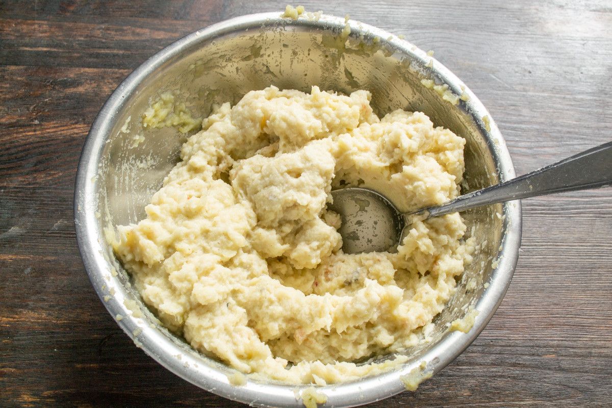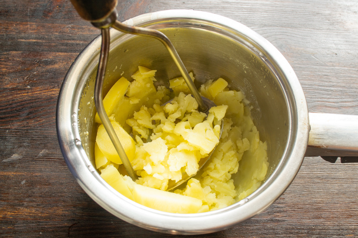 Сырой картофель очищаем от кожуры, нарезаем ломтиками толщиной около 1 сантиметра. Заливаем кипятком, отвариваем до готовности. Вареный картофель разминаем пюре или протираем сквозь сито, добавляем сливочное масло. Перемешиваем, остужаем до комнатной температуры, солить не нужно. Вы также можете использовать остатки вчерашнего картофельного пюре в этом рецепте.