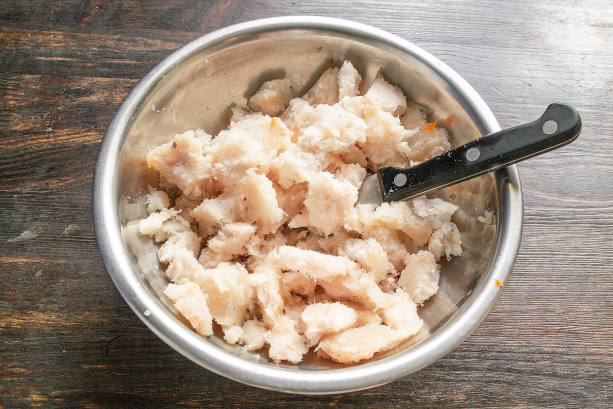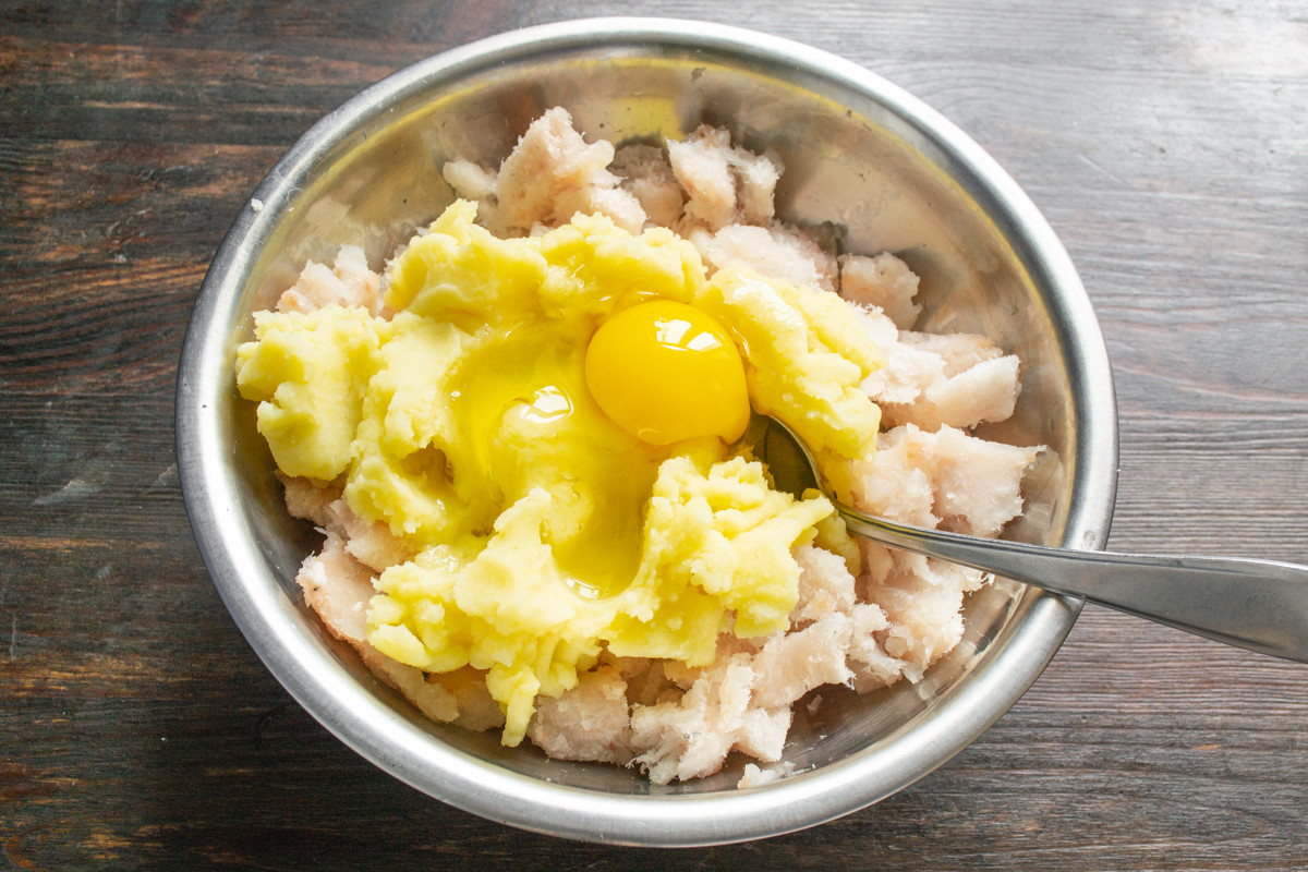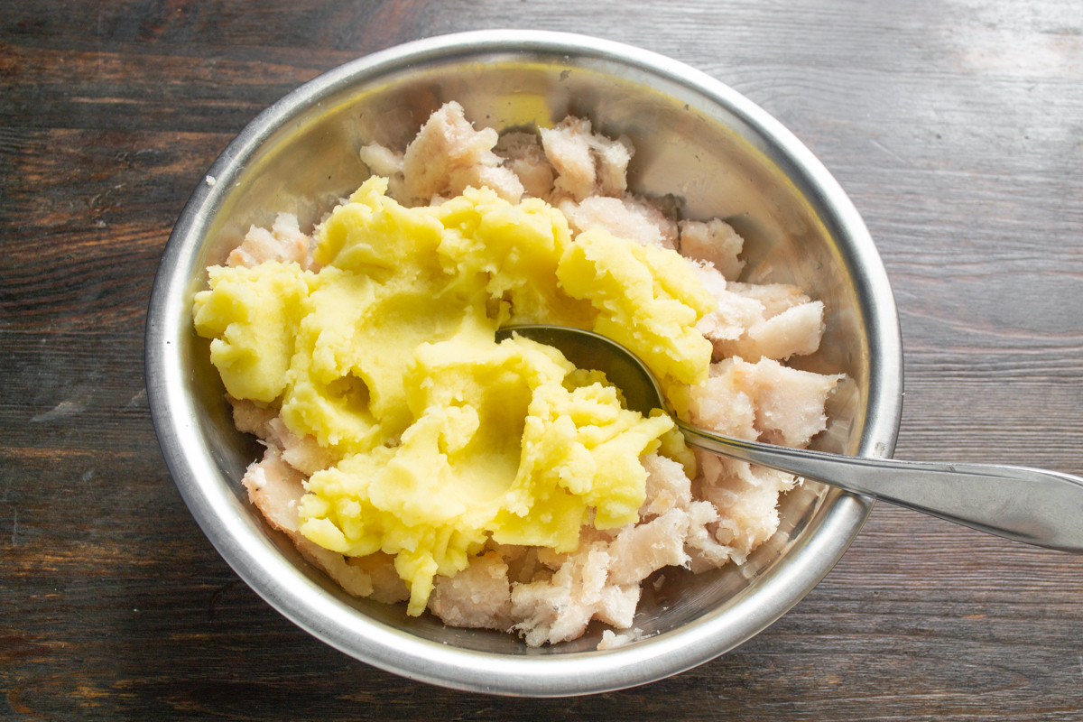 К рыбному фаршу добавляем остывшее картофельное пюре. Нельзя смешивать сырую рыбу и горячее пюре!