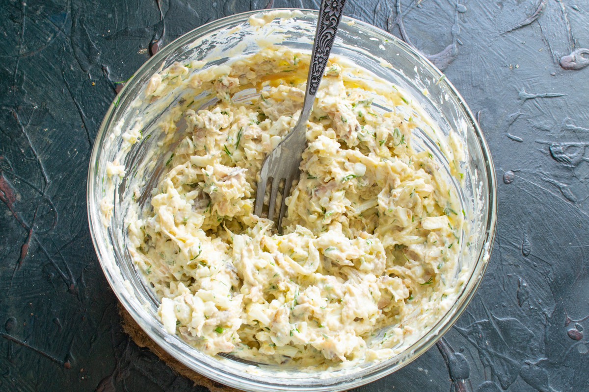 Тщательно перемешиваем салат. Если вы любите однородный паштет, то можно измельчить ингредиенты в блендере до кремового состояния. Затем переложить массу в кулинарный мешок с насадкой и отсадить в тарталетки красивый «рыбный крем» в виде розочек.