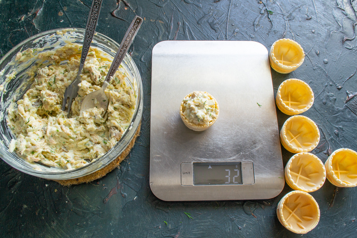 На одну порцию понадобится примерно 30 г салата, это столовая ложка с небольшой горкой. Чтобы все порции вышли одинаковыми, воспользуйтесь кухонными весами.