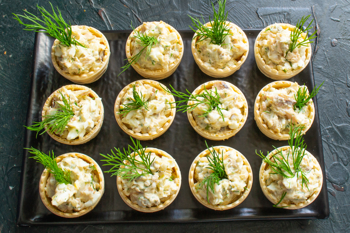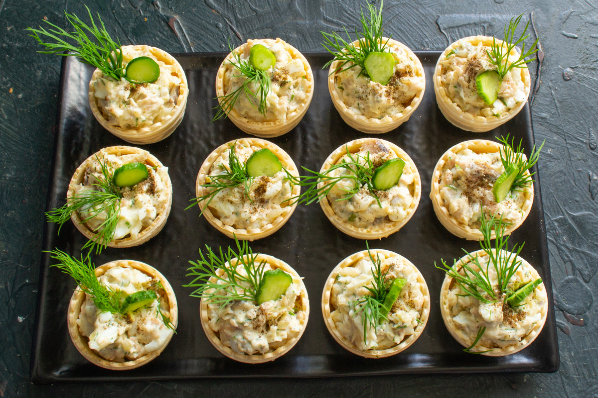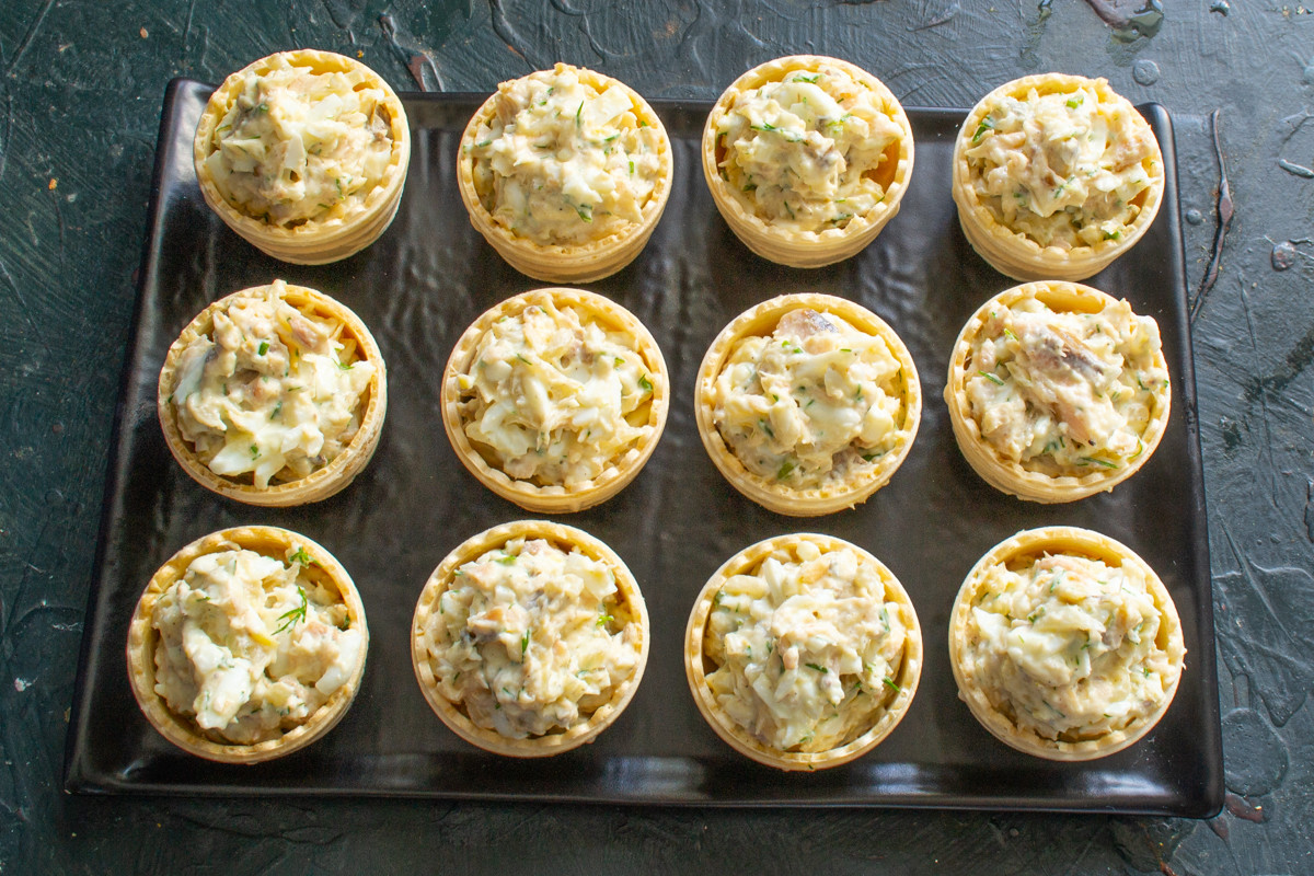 Наполняем тарталетки салатом, ставим на поднос или на блюдо.
