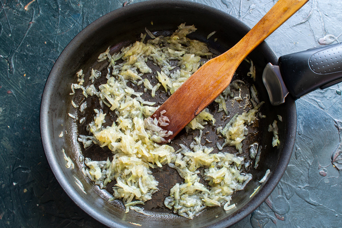 Репчатый лук режем очень мелко. Сковороду смазываем оливковым маслом, кладем столовую ложку сливочного. В растопленное масло бросаем мелко нарезанный лук, посыпаем солью и перцем. Обжариваем лук 7-8 минут на умеренном огне, остужаем до комнатной температуры. Лук не нужно зажаривать до коричневых чипсов, в салате это не уместно.