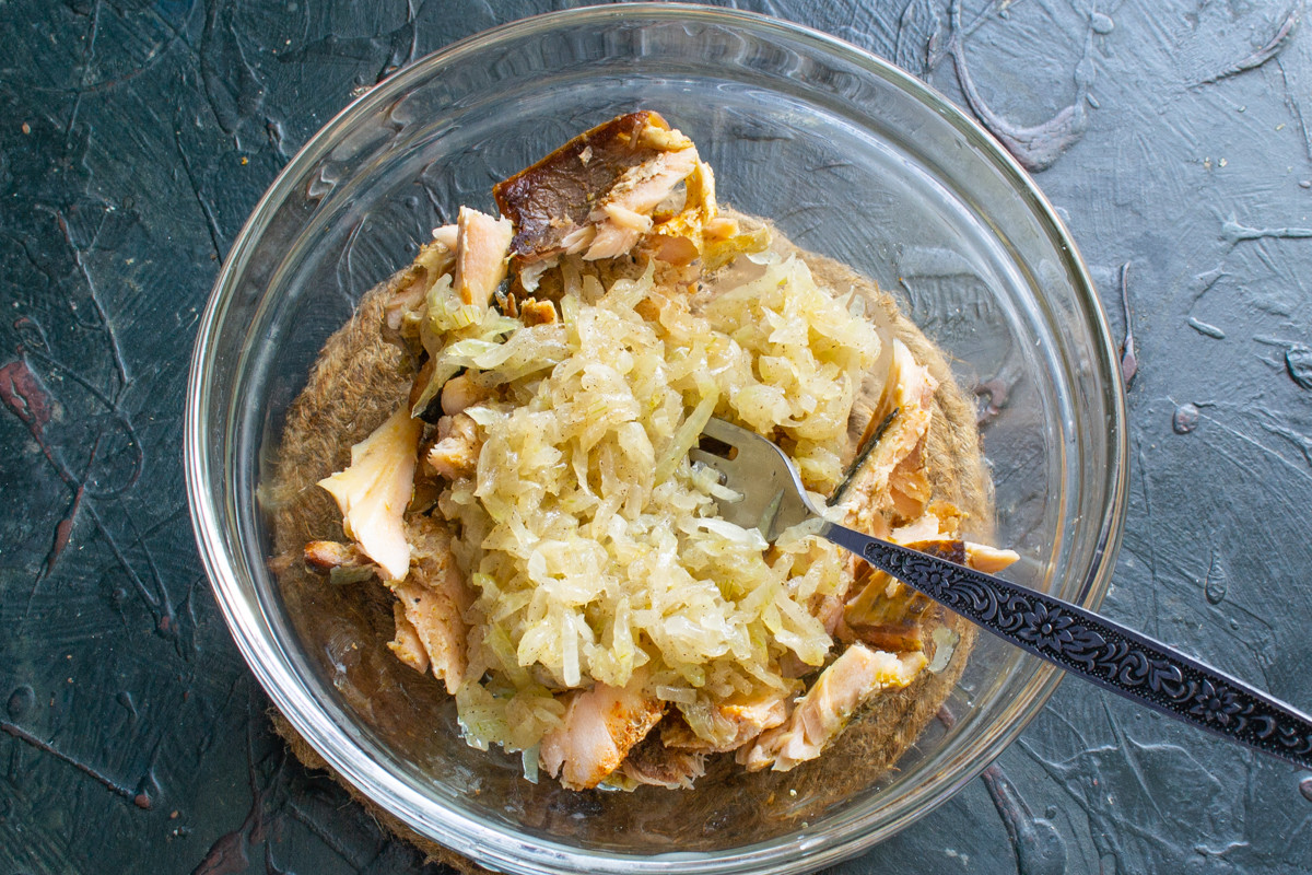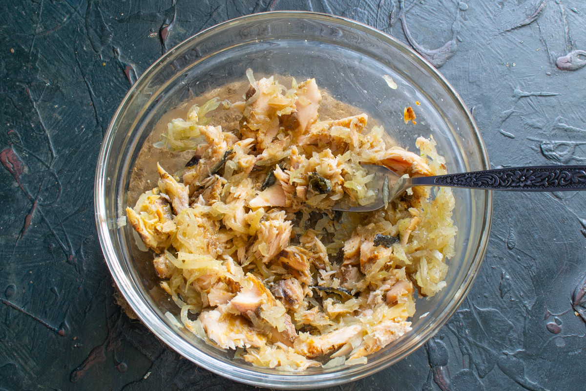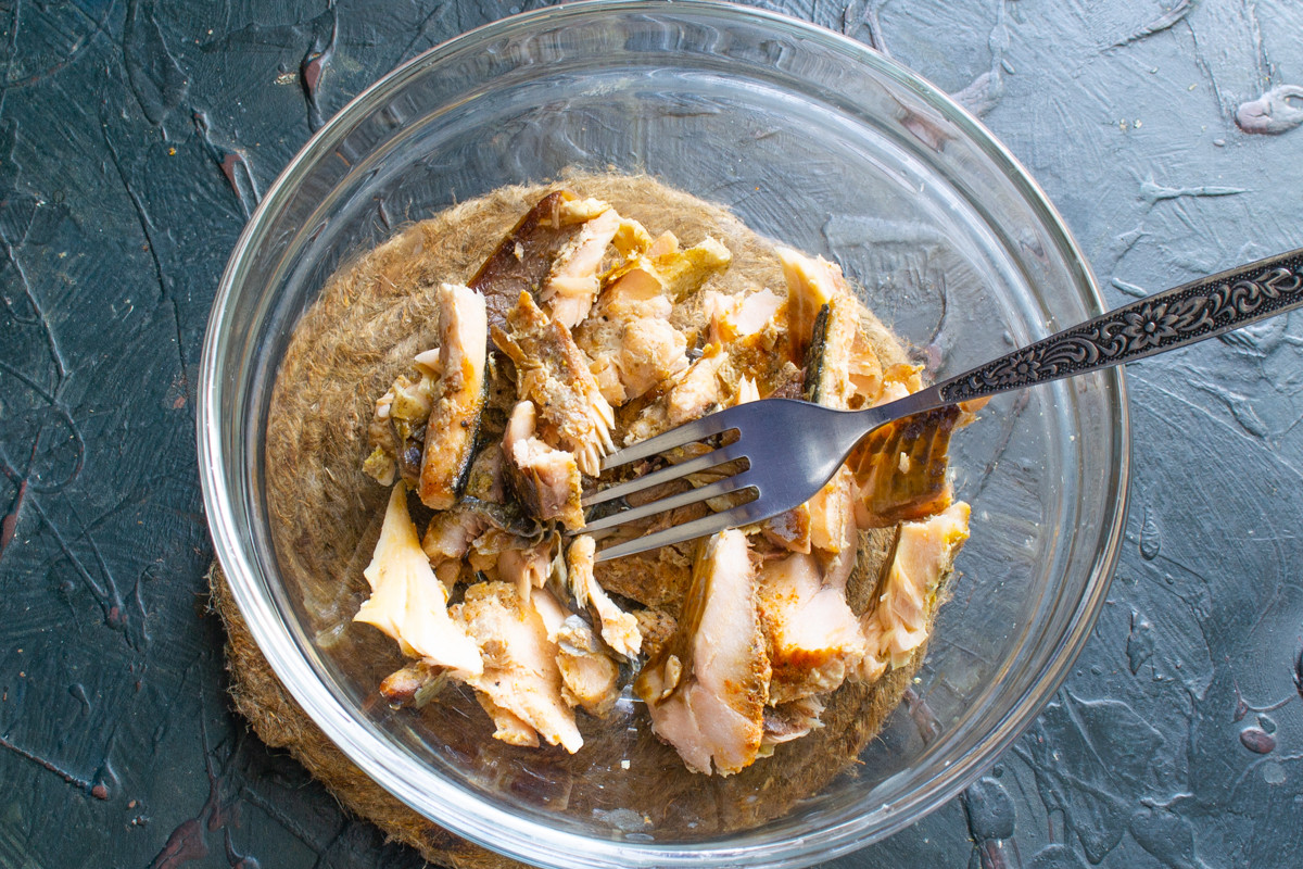 Лосось разминаем вилкой, выбираем видимые косточки. Консервированная горбуша также подойдет для этого рецепта.