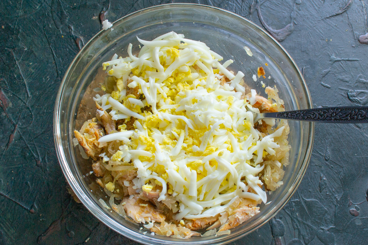 Яйца отвариваем вкрутую: заливаем холодной водой, нагреваем до кипения, оставляем в горячей воде на 10 минут. Сваренные таким образом куриные яйца будут вкусными, желток сохранит желтый цвет, белок не будет переваренным и жестким. Натираем вареные яйца на терке или рубим мелко, добавляем к остальным ингредиентам.