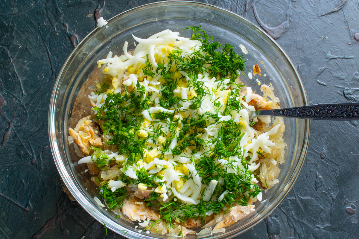 Добавляем остывший жареный лук к лососю. Продукты для приготовления салата должны быть комнатной температуры, не смешивайте теплые ингредиенты!