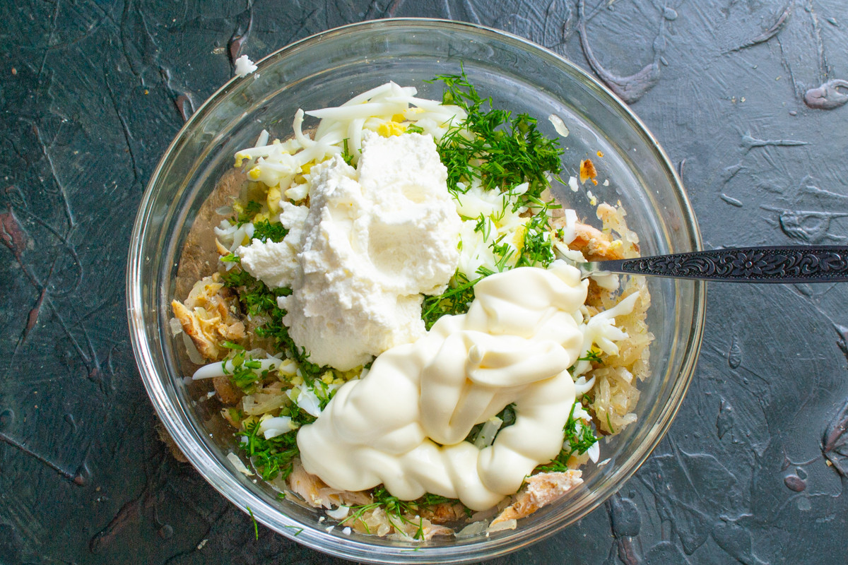Добавляем мягкий сливочный сыр и майонез. Творожный сыр или крем-чиз идеально подходит к рыбе.
