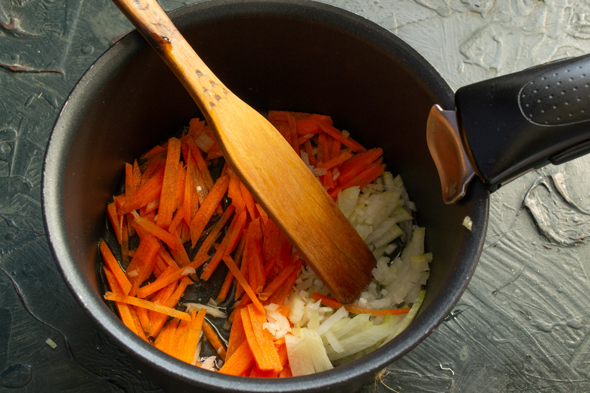 Нарезаем мелко небольшую головку репчатого лука, морковь шинкуем тонкой соломкой. В кастрюльку с толстым дном наливаем 2 столовые ложки рапсового масла. Кладём измельченные овощи в разогретое масло, обжариваем 5 минут, пока не станут мягкими.