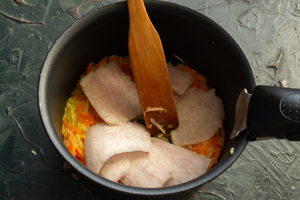 Рыбный фарш нарезаем тонкими пластинками, добавляем к овощам. В этом рецепте можно использовать замороженный фарш, его довольно просто нарезать широким острым ножом, даже если фарш мерзлый. Если такой способ для вас сложен, то нужно заранее достать замороженный фарш из морозильной камеры и оставить в холодильном отделении на несколько часов.