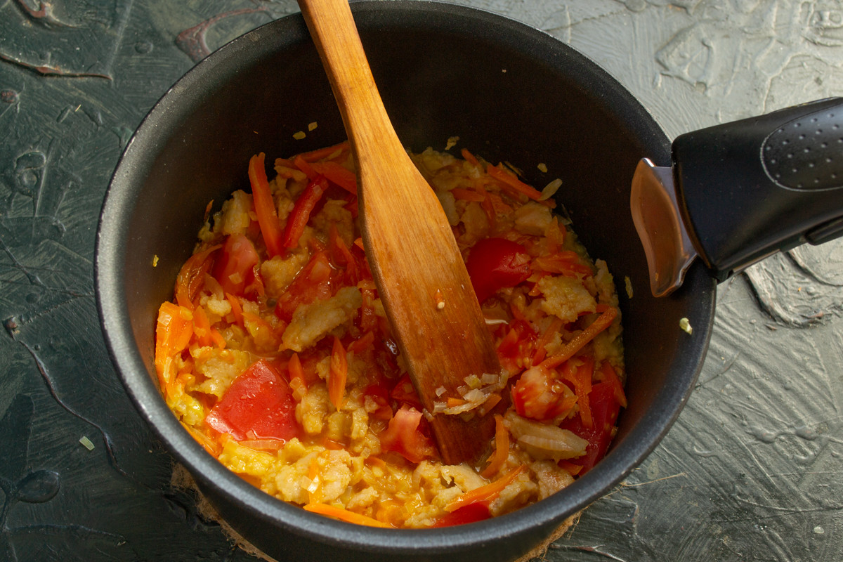 Красный большой помидор режем кубиками, добавляем к рыбе и овощам. Обжариваем всё вместе 10 минут, помешиваем, чтобы фарш не собирался в комки. Свежий помидор заменят консервированные в собственном соку томаты, очищенные от кожицы или томатная паста.