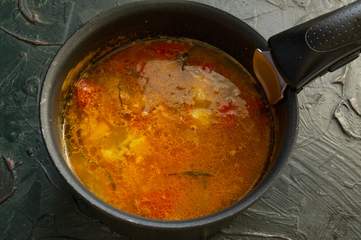 Вливаем 1 литр кипящей воды, по вкусу солим. Нагреваем суп до кипения, закрываем крышкой.