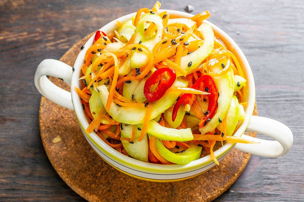 Салат из кабачков по-корейски – великолепная холодная закуска, которая вкусна сама по себе. Такой салат можно подать в качестве гарнира к мясному или рыбному блюду. Приятного аппетита.