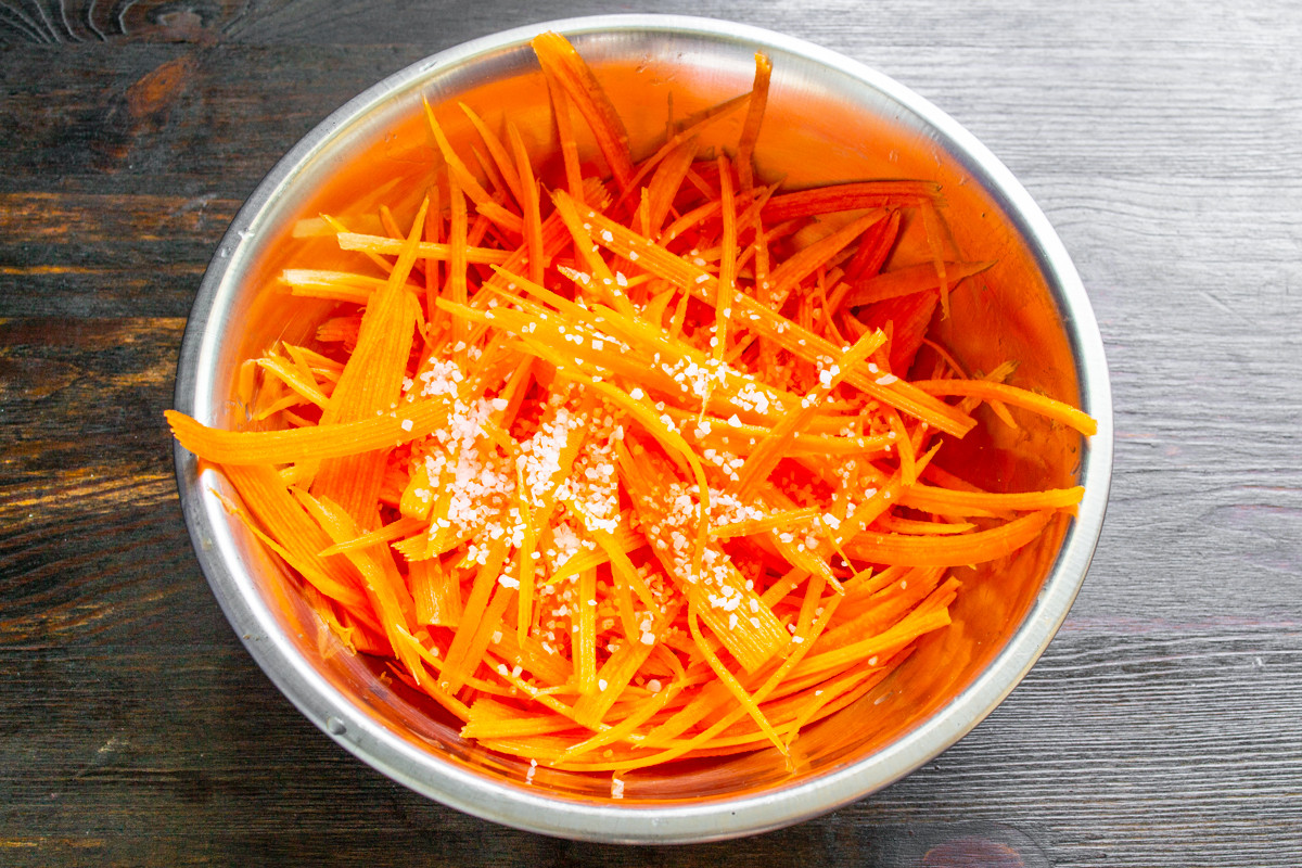 Морковь моем, скоблим. Овощным скребком с насадкой натираем на узкие тонкие полоски. Вы также можете использовать терку для корейской моркови или нашинковать морковь соломкой. Тертую морковь посыпаем солью по вкусу. Разминаем морковь с солью, оставляем на 30 минут.