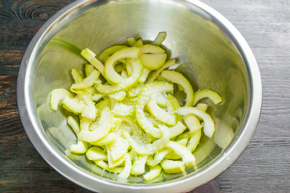 С кабачка счищаем кожуру овощным скребком. Разрезаем кабачок пополам, ложкой достаем семена и рыхлую семенную сумку. Очищенный кабачок нарезаем тонкими ломтиками. Кладем нарезанный кабачок в миску, посыпаем солью по вкусу, перемешиваем. Также как морковь оставляем на 30 минут.