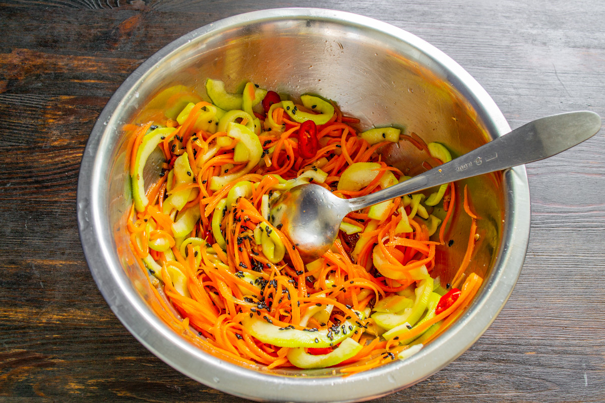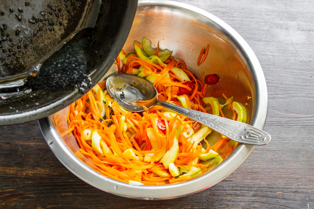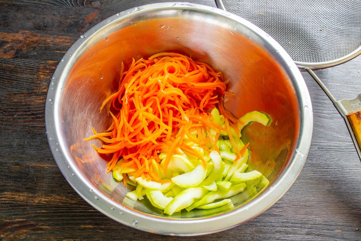 Через полчаса перекладываем овощи в дуршлаг и промываем проточной холодной водой. Оставляем на несколько минут, чтобы вода стекла. Смешиваем морковь с кабачком в большой миске.