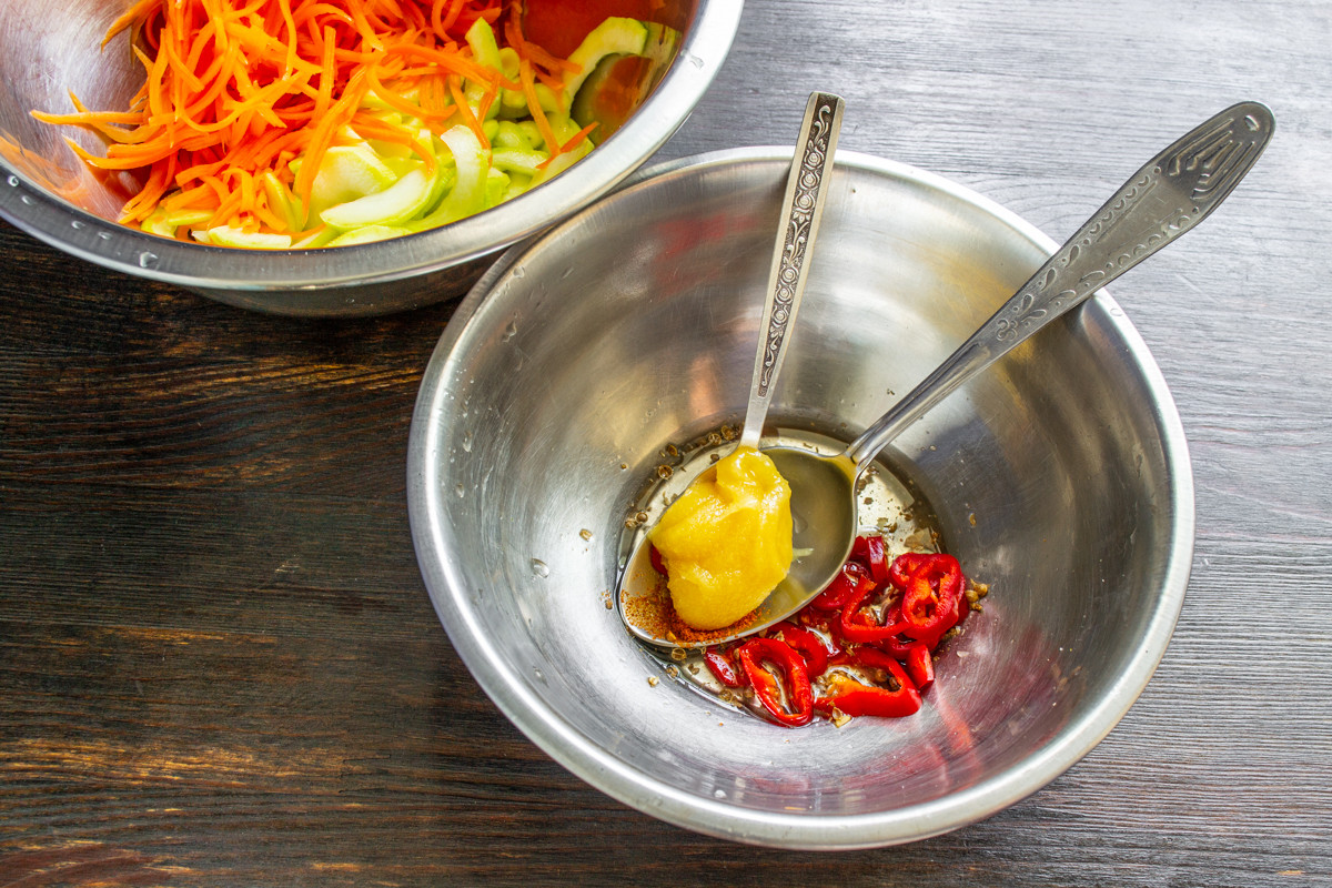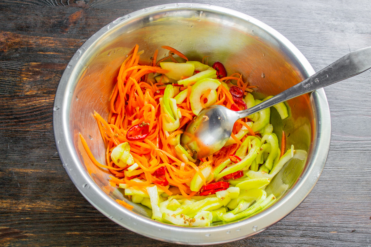 Добавляем маринад к кабачкам и моркови. Хорошо перемешиваем, оставляем на несколько минут, чтобы овощи впитали приправы.