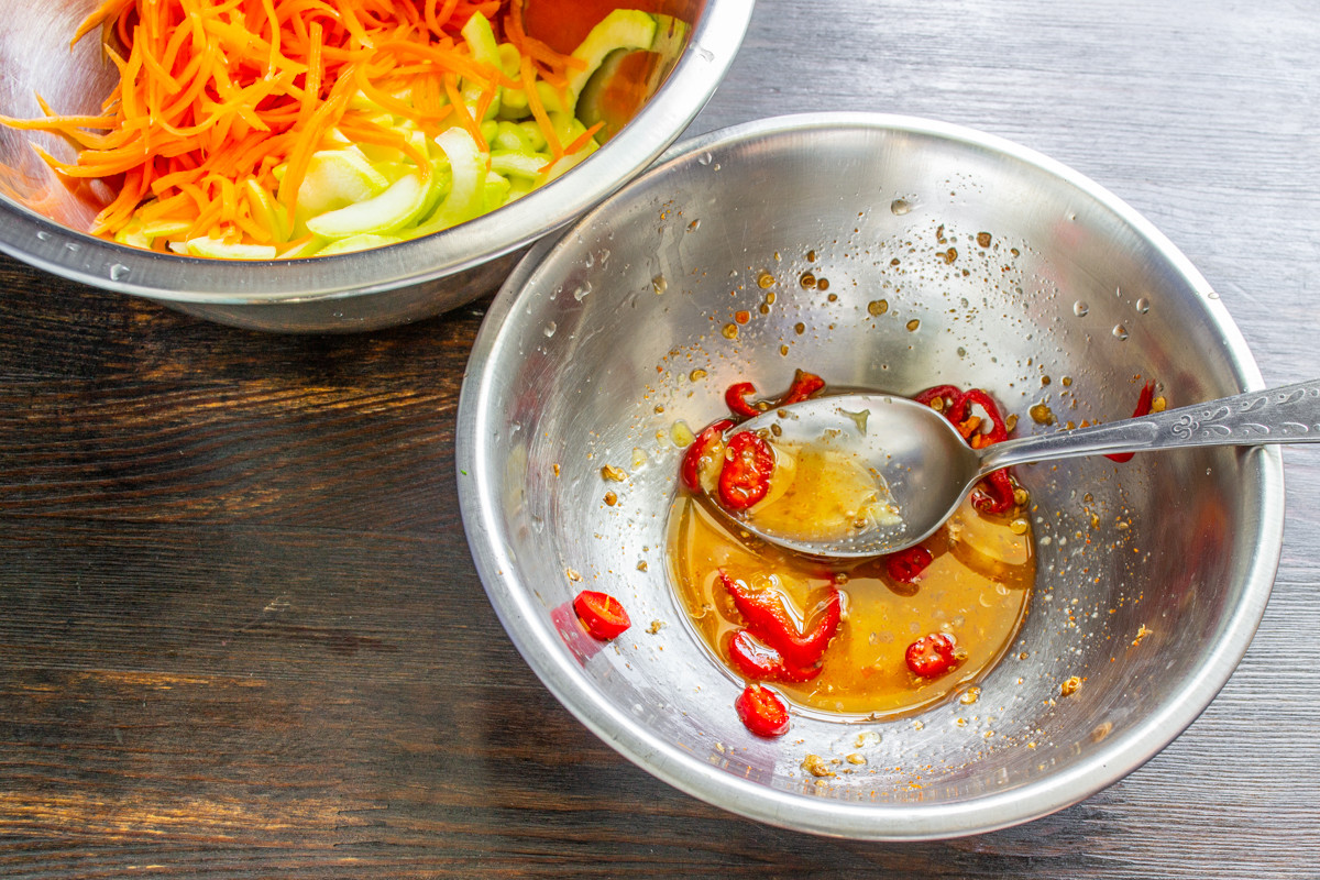 Готовим маринад. Зерна горчицы и кориандра поджариваем на сковороде без масла до появления дымка. Поджаренные семена растираем в ступе. Стручок красного чили разрезаем, достаем семена. Нарезаем чили колечками. Наливаем в миску белый винный уксус. Добавляем мед, нарезанный чили и растертые семена.