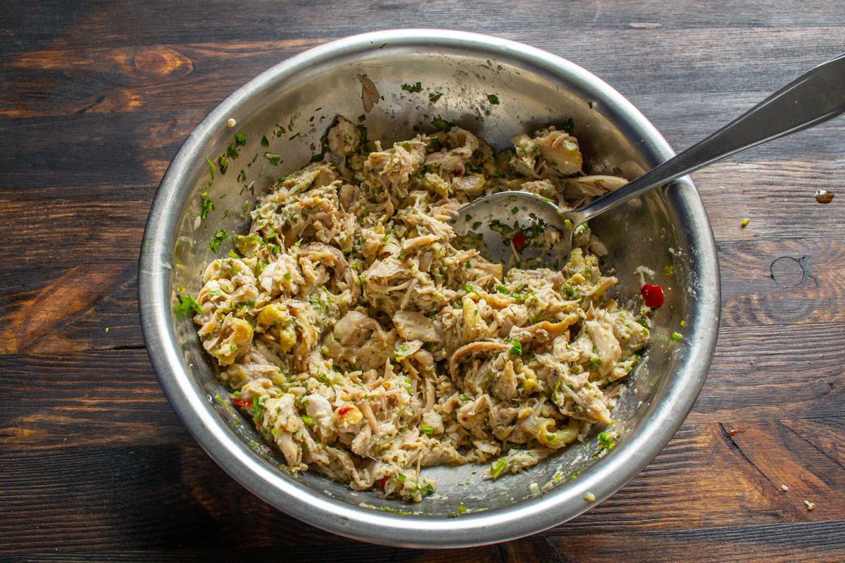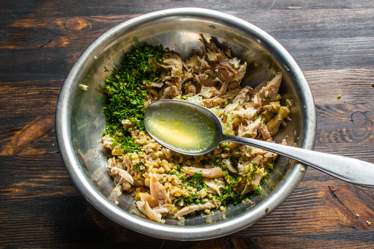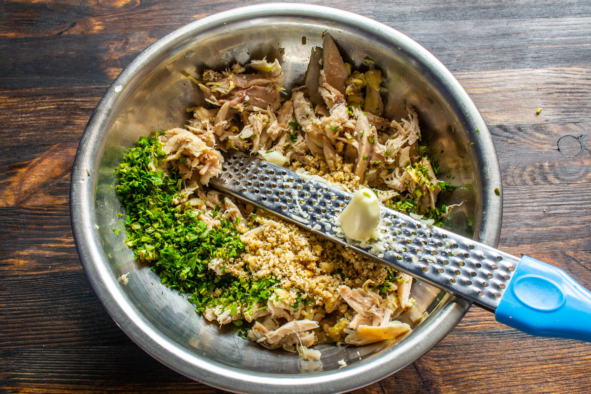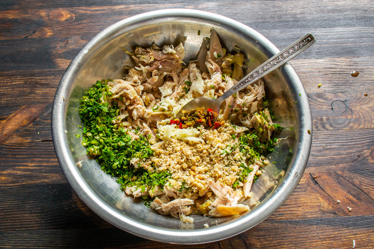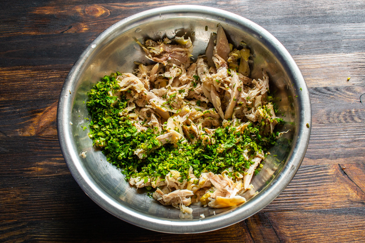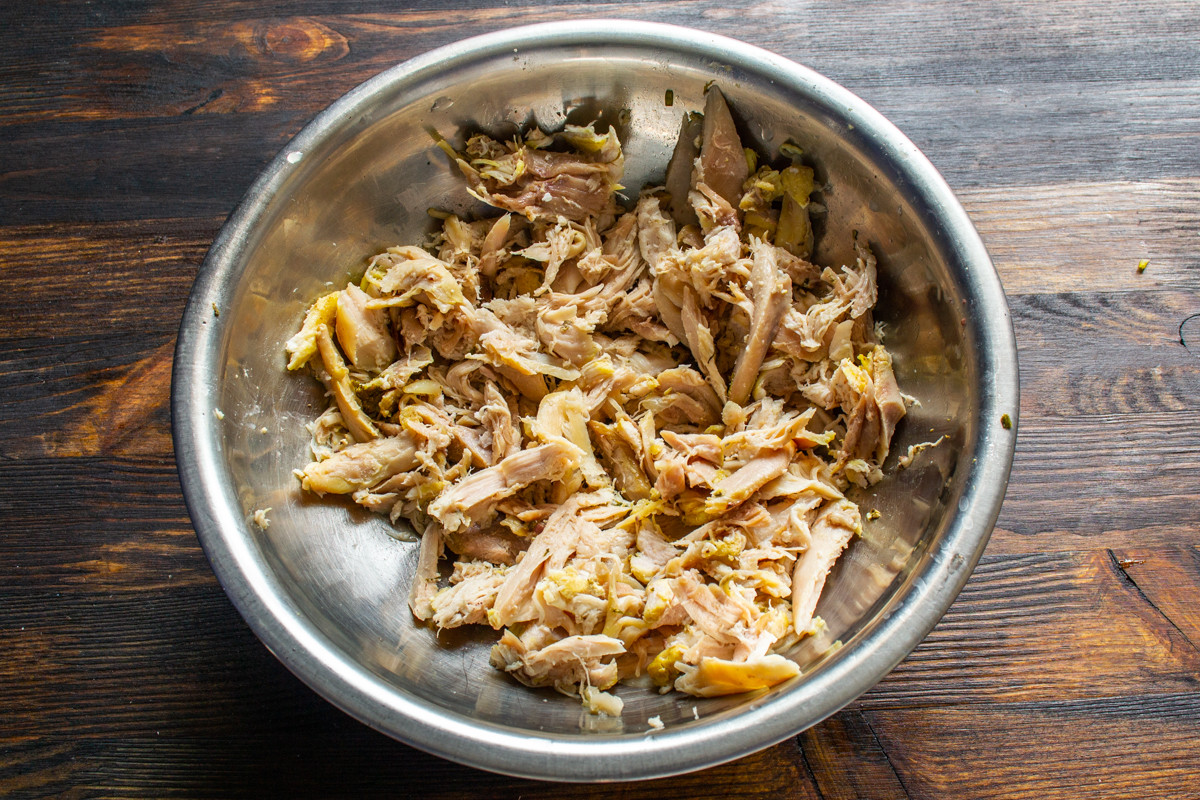 Кожу с курицы можно снять, если нет никаких предубеждений, то оставьте. Отделяем мясо от костей, разрываем на волокна вилками или режем мелко. Кладем нарезанную курицу в миску.