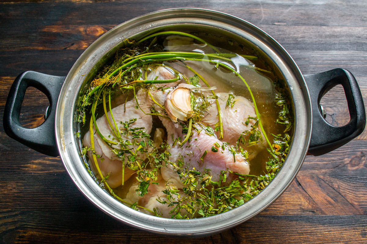 Готовим курицу. В большую кастрюлю кладем куриные голени. Наливаем полтора литра холодной воды. Добавляем луковицу в шелухе, два раздавленных зубчика чеснока, 2-3 чайные ложки сушеной петрушки и сельдерея или пучок свежей зелени. Кладем несколько горошин черного перца и лавровый лист. Нагреваем до кипения. Уменьшаем нагрев, чтобы бульон еле-еле кипел. Варим куриные голени на маленьком огне около часа. За 15 минут до готовности солим по вкусу.