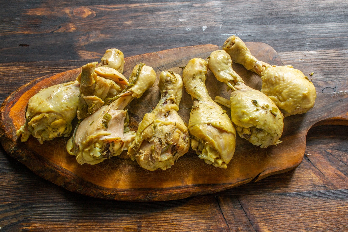 Остужаем куриные голени в бульоне. Достаем курицу, бульон процеживаем сквозь сито или через марлю.