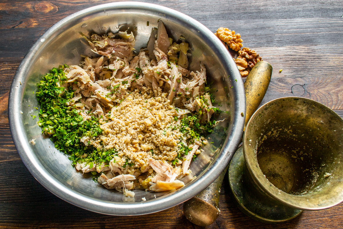 Вкусный и простой салат из курицы с грецкими орехами готовим без майонеза. Это холодная закуска по мотивам знаменитого грузинского соуса сациви. Соус готовят из грецких орехов с чесноком, приправами и бульоном. Подают к мясу, овощам и птице. Блюдо из отварной курицы с этим соусом также называется «Курица сациви».