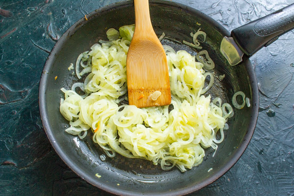 Репчатый лук нарезаем тонкими колечками. Жарим лук на растительном масле до прозрачного цвета. Советую посолить и добавить немного сливочного масла, так лук приобретет карамельный цвет и получится очень вкусным.