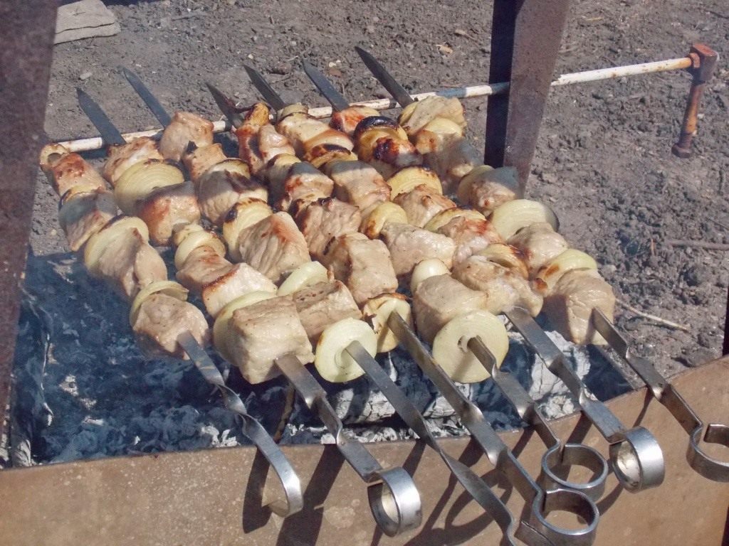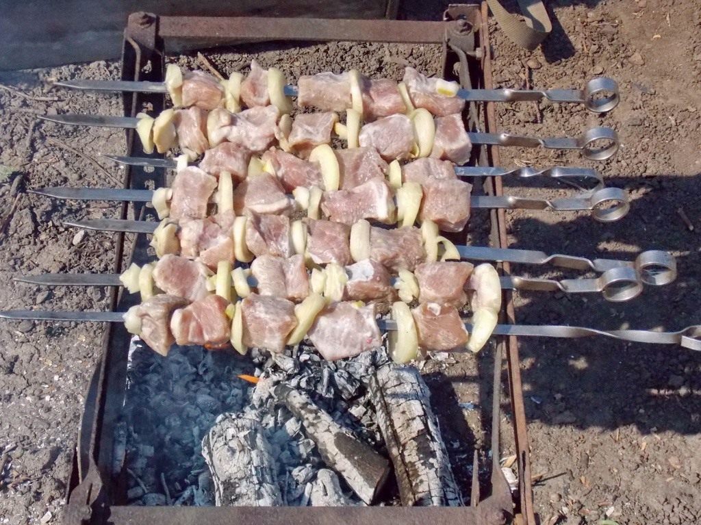 Располагаем шашлыки над углями и готовим, время от времени переворачивая. Если жара недостаточно, можно периодически раздувать угли, помахивая фанеркой или чем-то подобным. Если наоборот, жар слишком сильный, поднимаем шашлык повыше, а когда прорывается пламя – слегка сбрызгиваем водой.