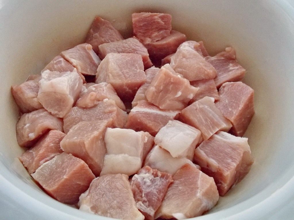 Разобравшись с нюансами, переходим к собственно приготовлению шашлыков. Мясо сполоснём, обсушим, нарежем кубиками со стороной примерно 3-5 см и поместим в эмалированную посуду. Алюминиевую лучше не использовать, так как под действием маринада посуда окисляется. Деревянная ёмкость также не лучший вариант, так как дерево впитывает сок и запах, а нам нужно, чтобы то и другое осталось в шашлыке, а не в посуде.