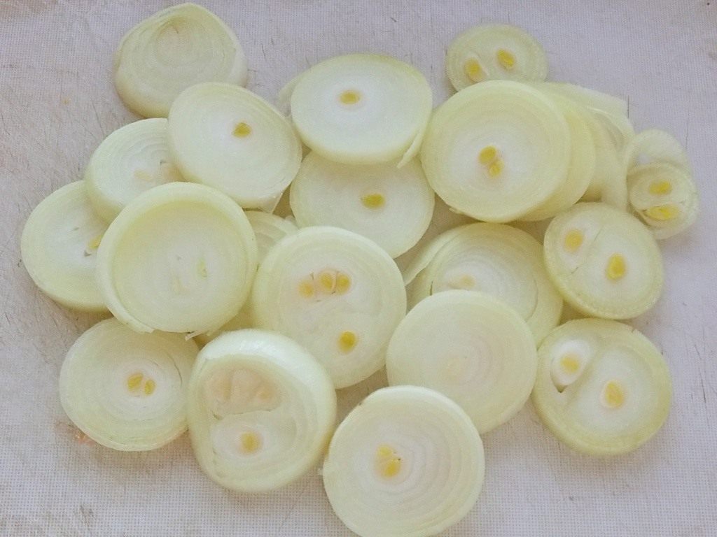 Лук очистим, помоем и нарежем кольцами толщиной 2-3 мм.