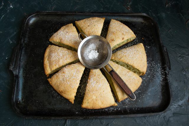 Готовый пирог разрезаем на 8 частей. На этом этапе его можно дополнительно запечь – поставить в сильно нагретый духовой шкаф на 3-4 минуты, получатся как бы припеченные сконы с хрустящими краешками.