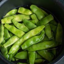 Стручковая фасоль, она же спаржевая, бывает разной степени зрелости. В этом году мне досталась слегка перезревшая, в стручках есть жесткие волокна, варится дольше. Такую фасоль лучше отварить заранее до полуготовности. Я варю в подсоленной воде примерно 20 минут отдельно от остальных овощей.