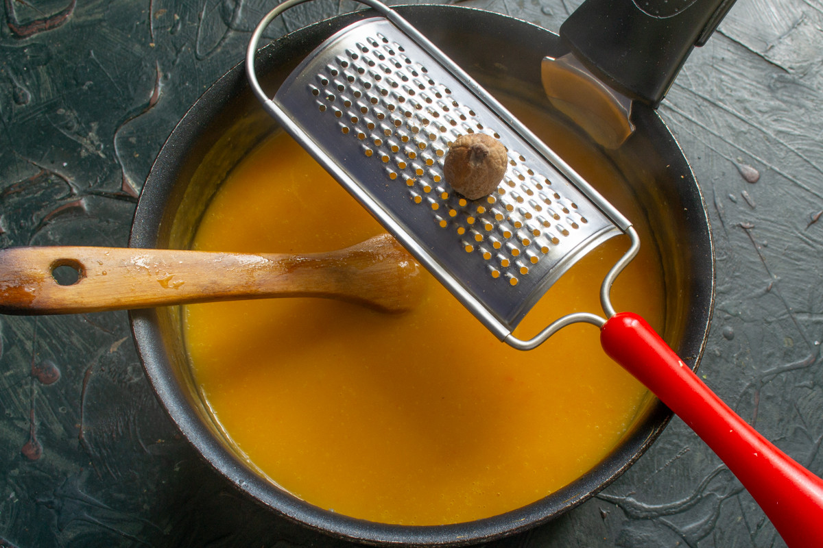 Добавляем щепотку мускатного ореха, натертого на мелкой терке. Мускатный орех добавляйте в разумных пределах, достаточной небольшой щепотки, это специя с насыщенным ароматом. По вкусу солим. Нагреваем суп почти до кипения, но не кипятим, прогреваем несколько минут на маленьком огне супу со сливками лучше не давать закипеть.