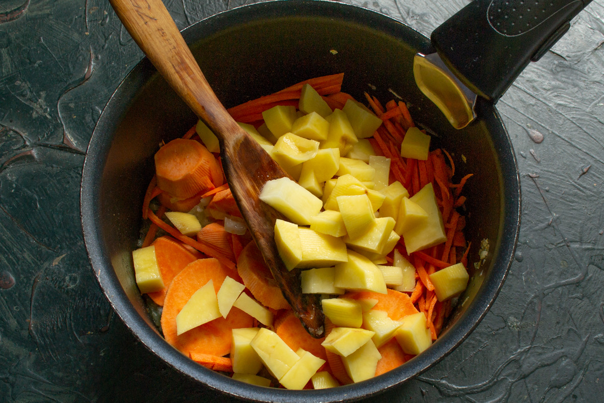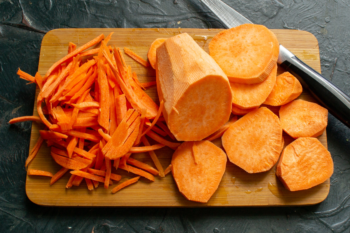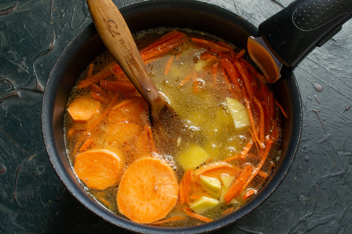 Сладкий картофель и морковь чистим от кожуры. Морковь режем тонкой соломкой, сладкий картофель кружочками или кубиками. Морковь варится дольше, поэтому резать нужно мельче.