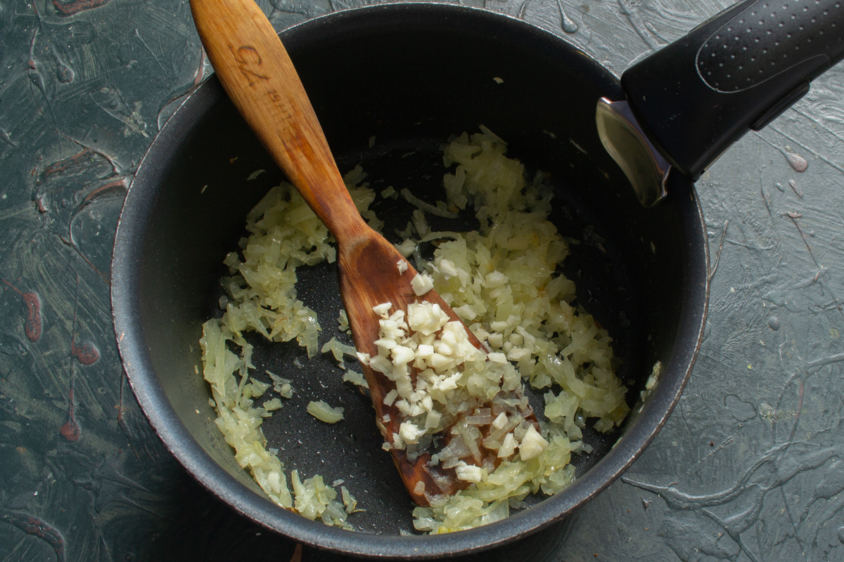 Нарезаем лук мелкими кубиками. Измельчаем чеснок. Растапливаем в кастрюльке сливочное масло. Бросаем в кастрюльку с маслом лук и чеснок, обжариваем на небольшом огне 5-7 минут.