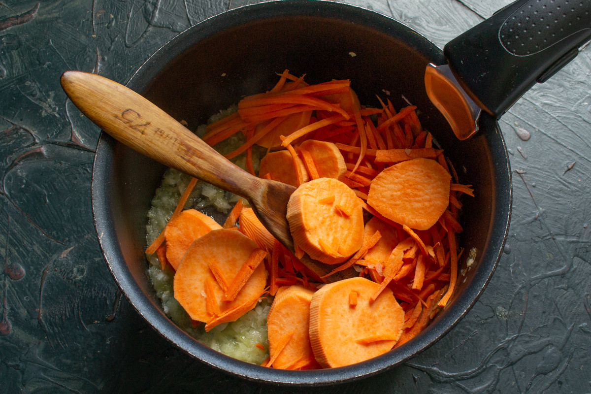 К обжаренному луку добавляем сладкий картофель и морковь.