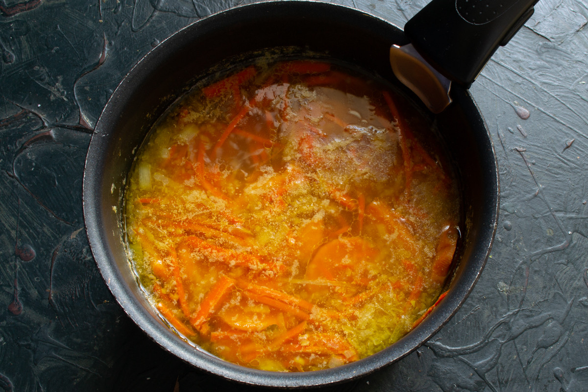 Наливаем 1 литр кипятка или бульона. Подойдет любой бульон – овощной, куриный, даже рыбный, если готовить с треской или хеком.