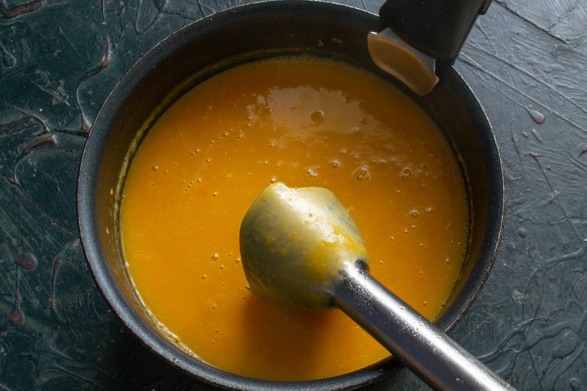 Погружным блендером измельчаем ингредиенты до кремового состояния. Как вариант можно протереть сквозь сито или размять толкушкой, однако в этом случае текстура супа будет грубоватой, с кусочками.