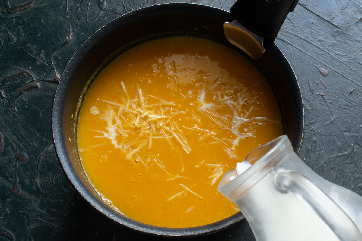 На мелкой терке натираем твердый сыр, сорт сыра на ваш вкус, вкуснее с пикантным, соленым. Добавляем тёртый сыр в кастрюльку с супом, вливаем сливки. Сливки чем жирнее, тем вкуснее, но и калорийность будет соответственно больше.