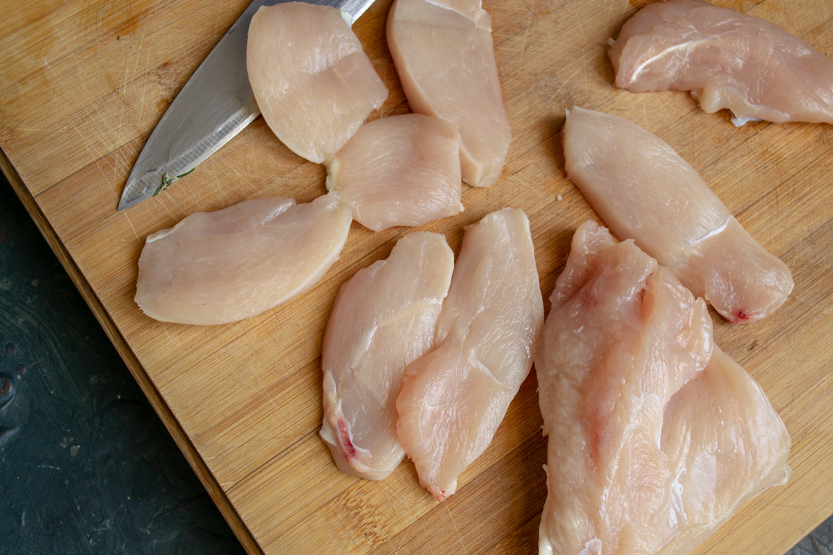С куриной грудки снимаем кожу, срезаем филе с кости. Нарезаем филе поперёк волокон ломтиками толщиной чуть меньше сантиметра. Куриную кожу и косточки советую заморозить, когда соберется несколько куриных запчастей можно сварить бульон.
