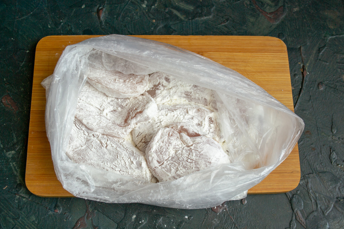 В пакет насыпаем пару столовых ложек картофельного или кукурузного крахмала, кладём кусочки курицы. Завязываем пакет узлом, встряхиваем, пока крахмал полностью не покроет мясо. В рецепте куриной грудки в кляре солить мясо не нужно, соль будет в тесте.