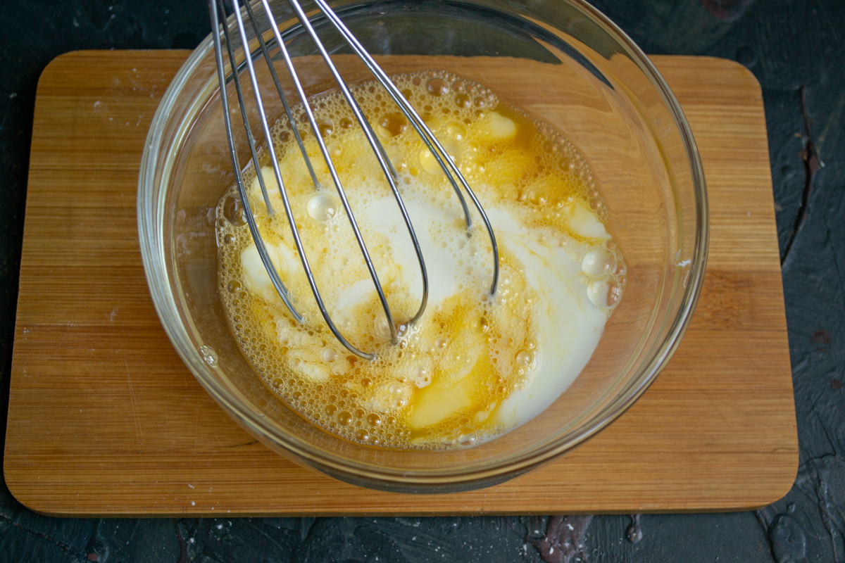 Наливаем холодное молоко в миску, смешиваем жидкие ингредиенты венчиком.