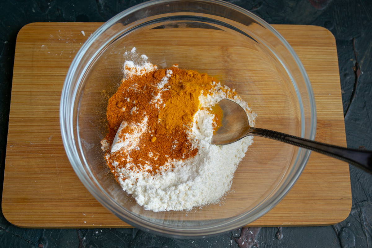 Насыпаем в другую миску пшеничную муку, добавляем молотую сладкую паприку и молотую куркуму. Хорошо перемешиваем сухие ингредиенты.