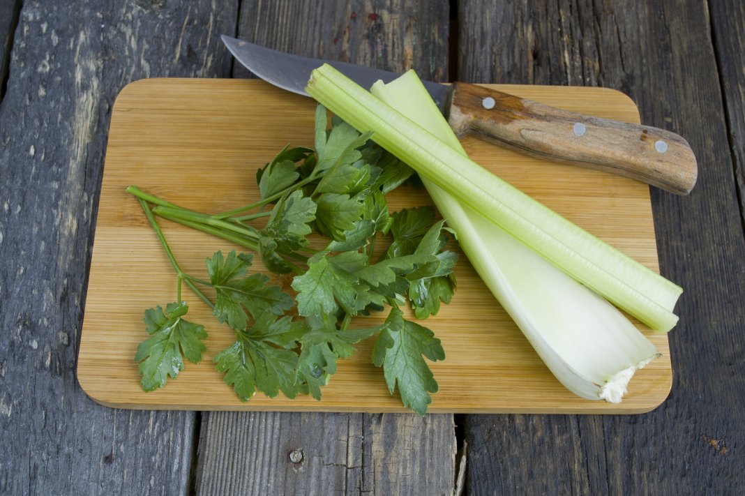 К луку добавляем нарезанный пучок свежей петрушки (и зелень, и стебли) и стеблевой сельдерей.
