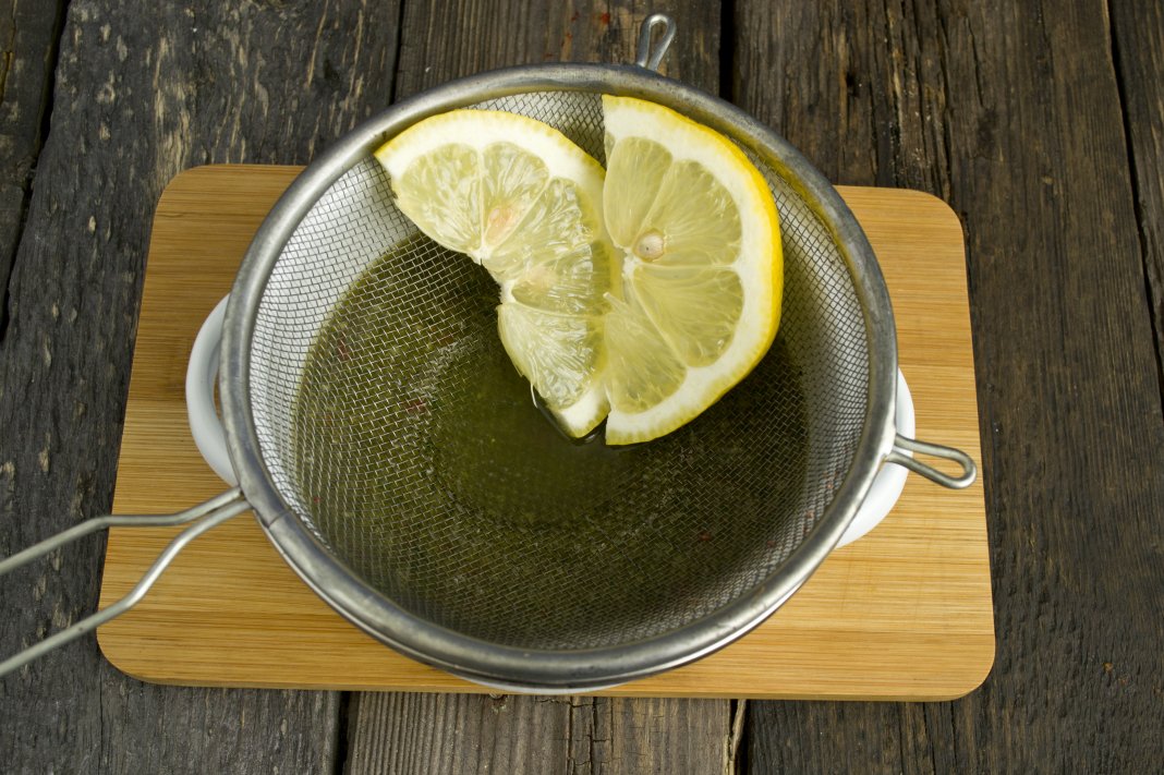 Выжимаем сок из целого лимона, процеживаем через сито, чтобы в маринад не попали лимонные косточки.