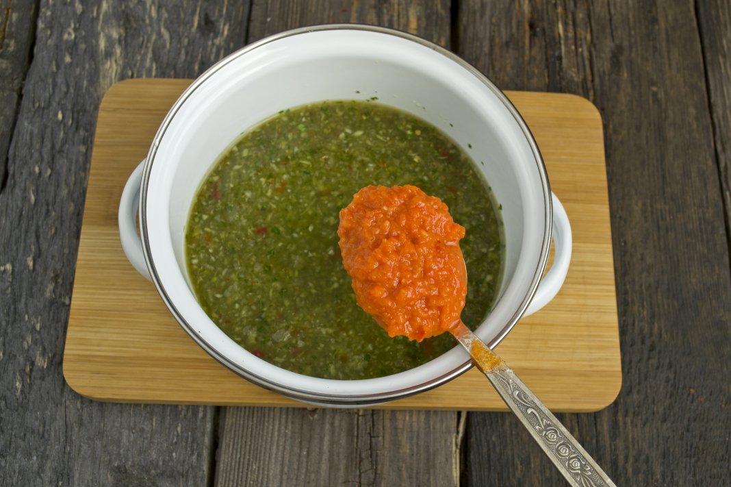 Измельчаем овощи до получения однородной массы, если она получается очень густой, то можно добавить немного фильтрованной воды, чтобы процессор легче перемолол ингредиенты. Насыпаем молотую паприку и хмели-сунели.