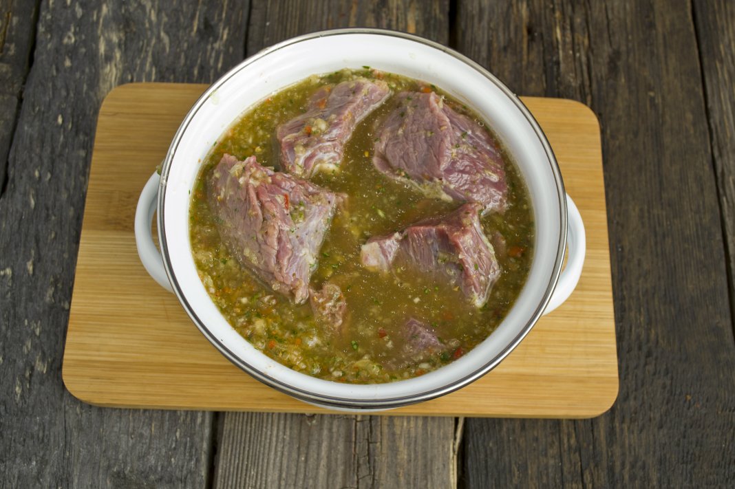Кладём куски говядины в подготовленный маринад, убираем в прохладное место на 6-8 часов.