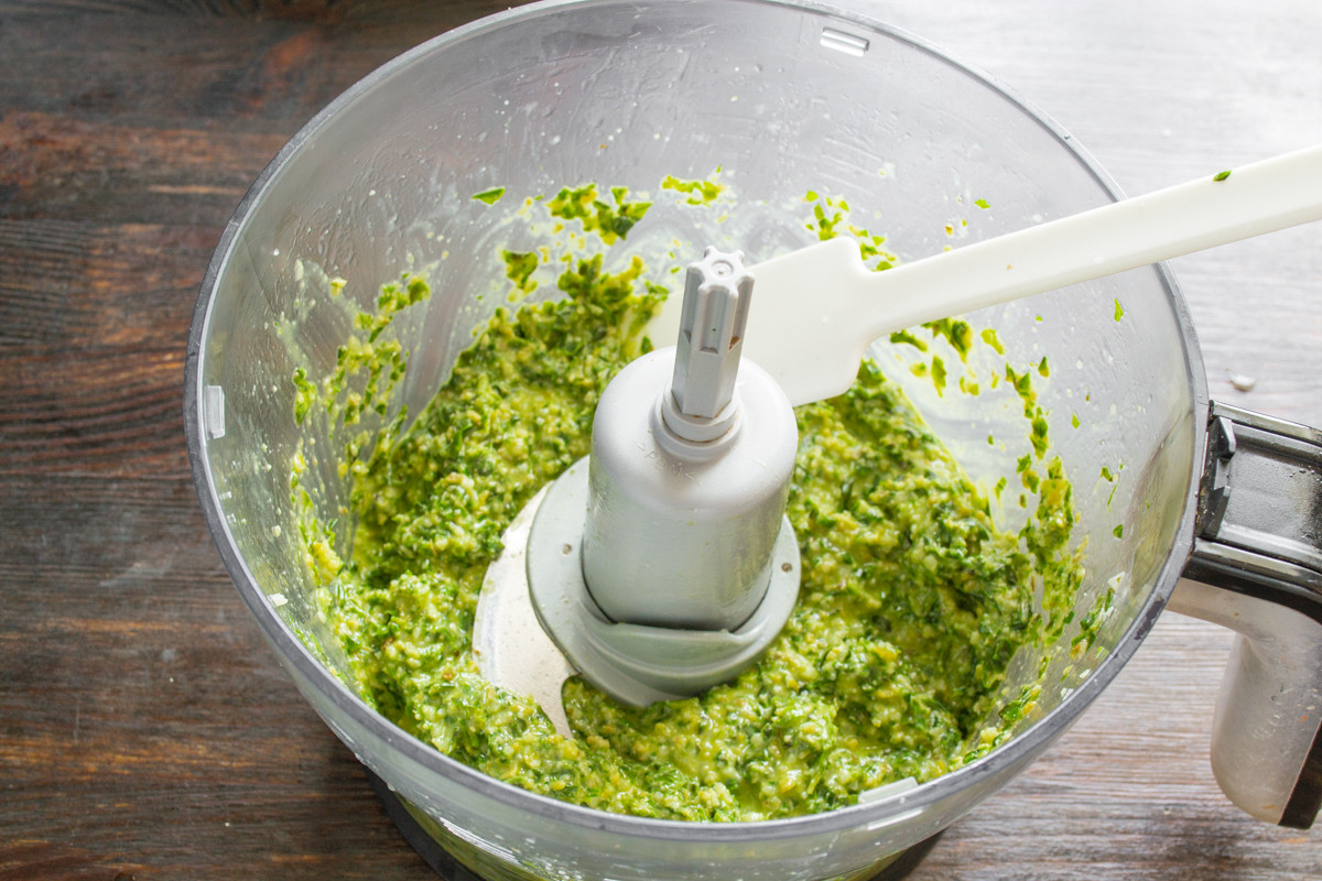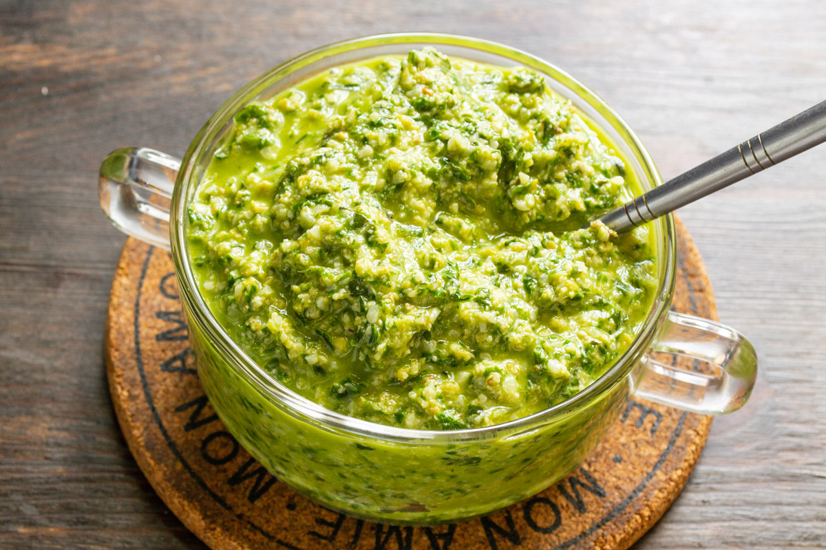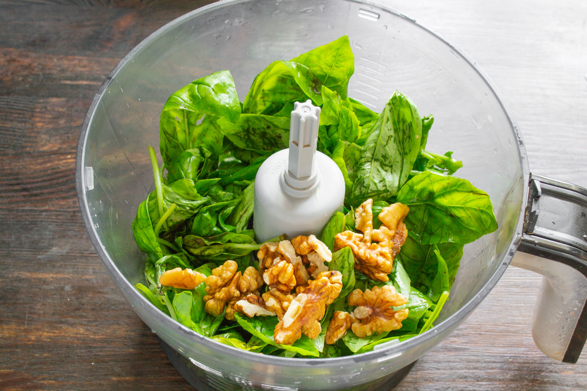 Слово песто значит толченый, родиной соуса считается Генуя. В классическом рецепте есть семена сосны пинии, это как кедровые орехи, только по-итальянски. Для пикантности вы можете добавить в соус зубчик чеснока.