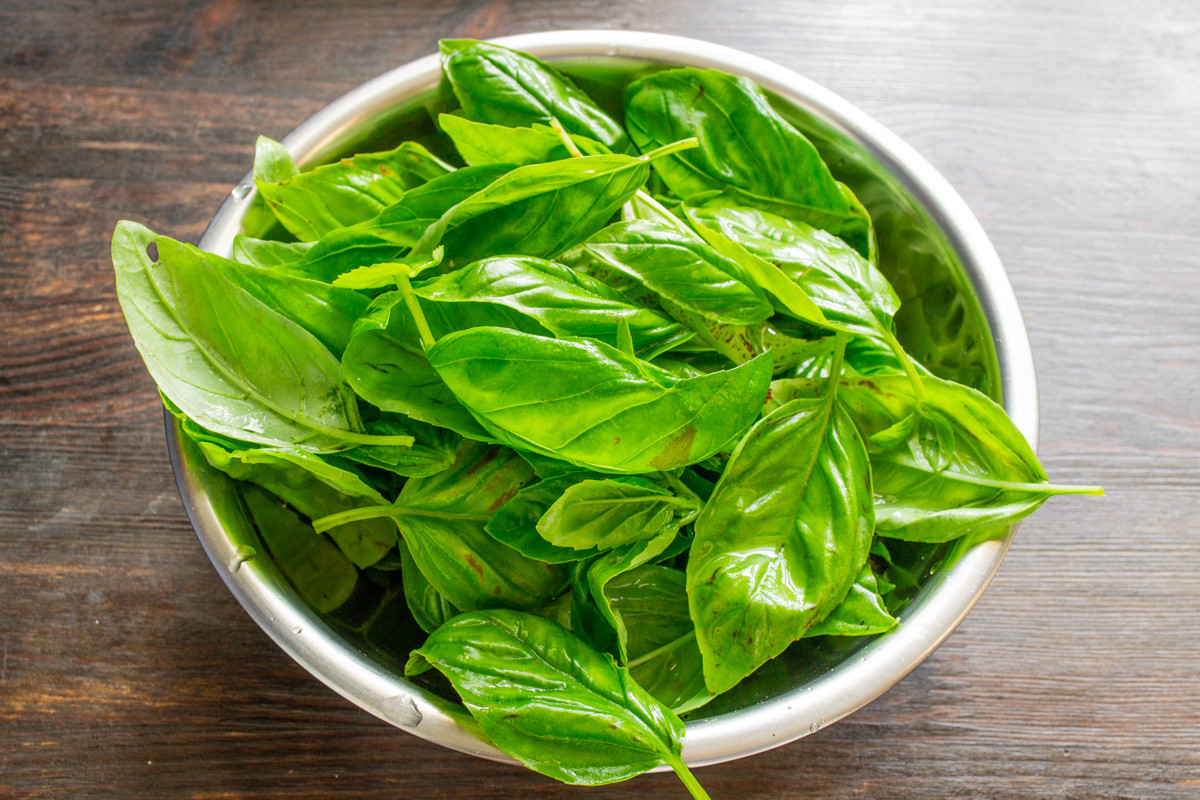 Со стеблей базилика срываем листики. Замачиваем базилик в холодной воде, хорошо промываем и высушиваем или отжимаем, лишняя вода нам ни к чему. Стебли базилика можно использовать для варки бульонов.
